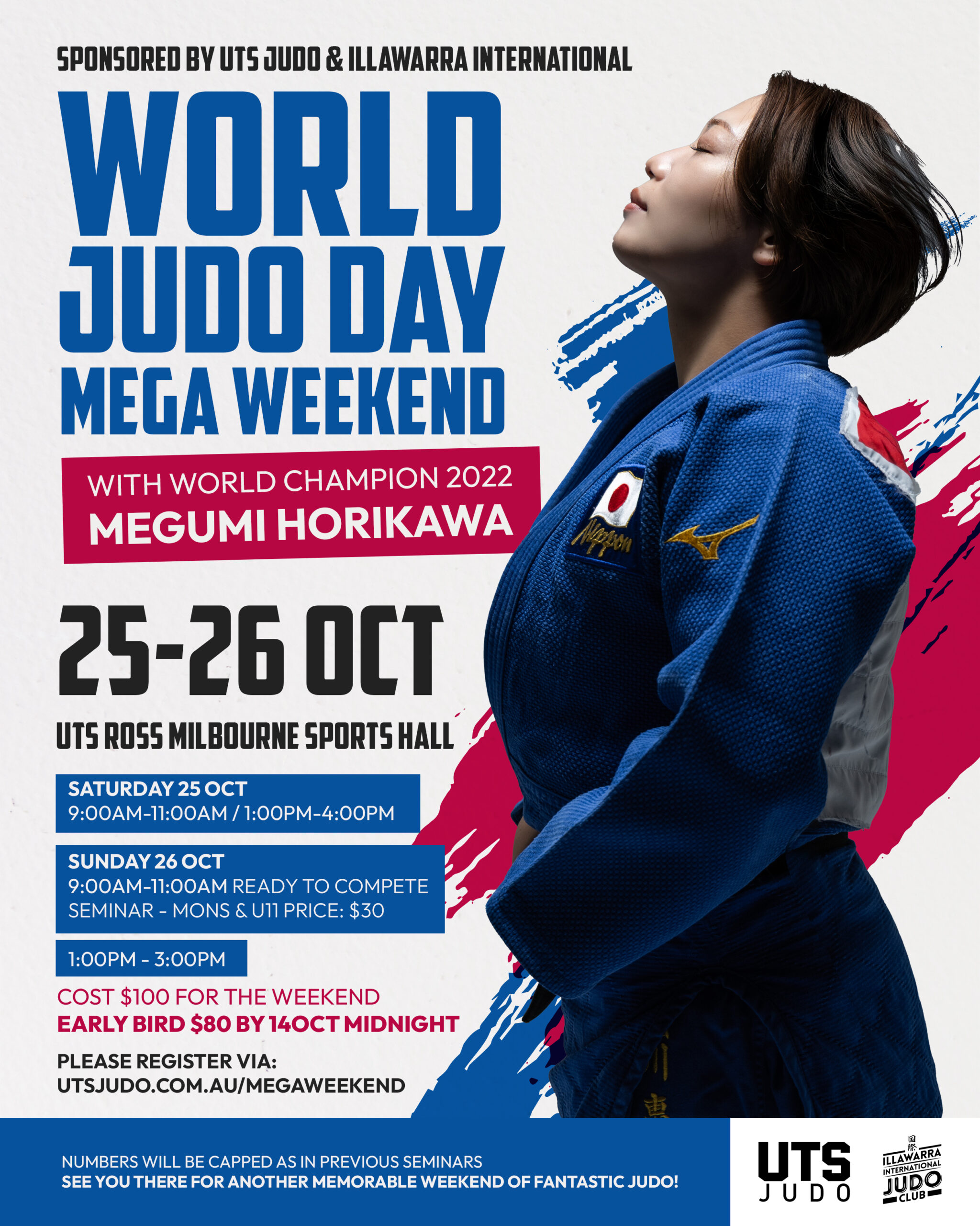 UTS Judo Inc., in partnership with Illawarra International Judo Club, is proud to present the World Judo Day Mega Weekend, featuring Megumi Horikawa – World Champion 2022 and 4× Grand Slam Champion.